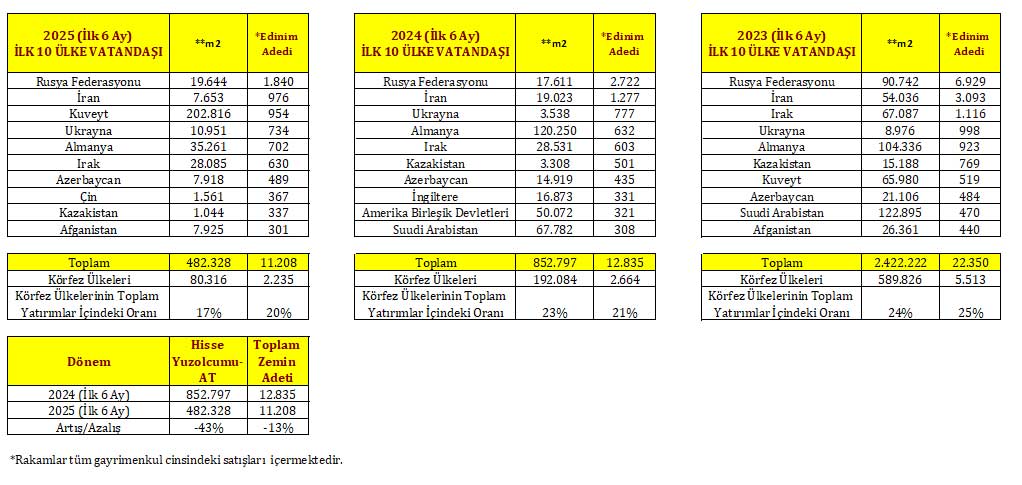 2025 yılı ilk 6 ay itibariyle, yabancıların Türkiye genelindeki toplam hisseye isabet eden yüzölçümü bazında tüm gayrimenkul yatırımları incelediğinde, yüzölçümü bazında ilk sırada Kuveyt yer alıyor. Kuveyt’i Almanya, Irak, Rusya Federasyonu, Ukrayna, Afganistan, Azerbaycan, İran, Çin ve Kazakistan takip ediyor.