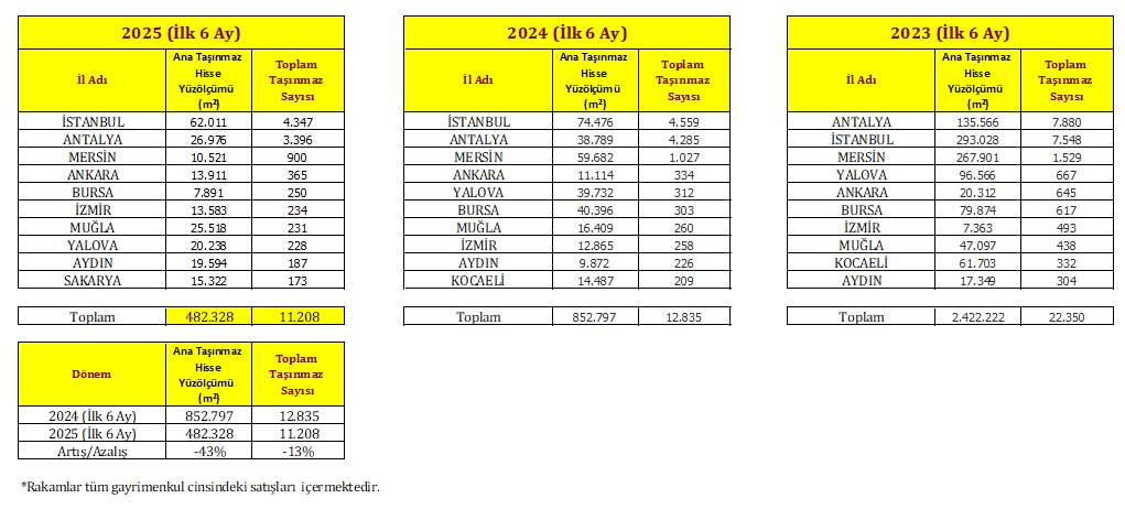Tüm gayrimenkul cinsinden 2025 yılı ilk 6 ay itibariyle en çok tercih edilen illerde satış adeti bazında ise ilk sırayı İstanbul aldı. İstanbul ilini sırası ile Antalya, Mersin, Ankara, Bursa, İzmir, Muğla, Yalova, Aydın ve Sakarya izledi.