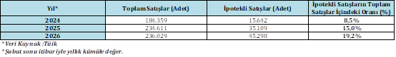 2026 yılı Şubat ayı sonu itibariyle gerçekleşen kümüle konut satışlarının içinde ipotekli satışların oranı %19,2 mertebelerinde gerçekleşti. 2025 yılı Şubat ayında bu oran aynı etkilerden dolayı %15 seviyelerindeydi.
