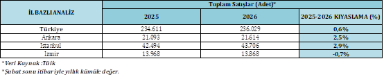İstanbul, İzmir ve Ankara özelinde bakacak olursak; 2026 yılı Şubat ayı sonu itibariyle kümüle konut satışlarının, 2025 yılı aynı dönemine nazaran Ankara’da %2,5 oranında, İstanbul’da %2,9 oranında arttığı, İzmir’de ise %0,7 oranında azaldığı görülmektedir.