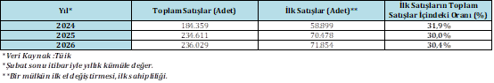 Konutun ilk defa el değiştirme verisi aslında konut satışlarından en önemli verisi durumunda. 2026 yılı Şubat ayında gerçekleşen ilk el konut satışları bir önceki yılın aynı ayına göre takribi %11 oranında artarak 37.785 adet açıklandı. 2026 yılı Şubat ayında, toplam kümüle konut satışları içinde ilk el konut satışlarının payı %30,44 olarak gerçekleşti.
