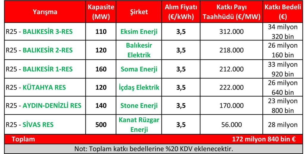 YEKA RES-2025’in megavat başına 180 bin Euro’luk bir ortalama katkı bedeliyle sonuçlandığını ifade eden Bayraktar, “Bugün yaptığımız rüzgâr ihalesinden devletimize 208 milyon Euro’luk bir katkı payı gelecek.” diye konuştu.