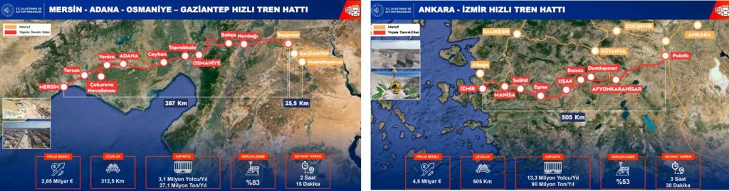 Karadeniz’in doğusunu batısına bağlayacak Samsun-Sarp Hızlı Tren Hattı’nın proje çalışmalarına başladıklarını, Aksaray-Ulukışla-Yenice Hızlı Tren Hattı ile kuzey-güney koridorunda yolcu ve yük talebi karşılanacağını söyleyen Bakan Uraloğlu, “501 kilometrelik Gaziantep–Şanlıurfa-Mardin-Nusaybin-Ovaköy hattını Kalkınma Yolu’na entegre ediyoruz. Malatya’yı hızlı tren ağına bağlayacak, 224 kilometrelik Sivas–Çetinkaya–Malatya ve 155 kilometrelik Narlı-Malatya hatlarını planladık.” diye konuştu.