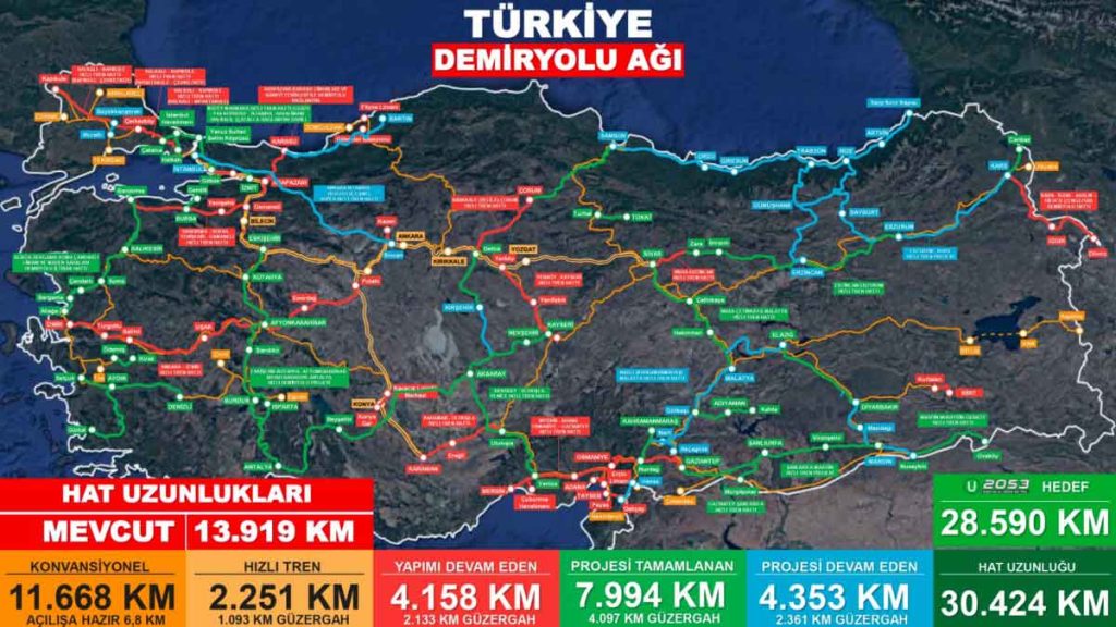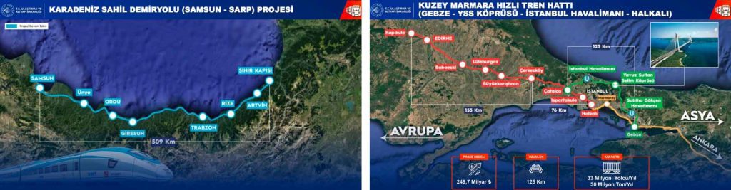 Demiryolu sektöründe devam eden diğer önemli projelerden Zengezur Yolu bağlantısını sağlayacak 224 kilometrelik Türkiye kesimi olan Kars-Iğdır- Aralık-Dilucu Demiryolu Hattı işine başladıklarını da belirterek “Divriği-Kars-Hudut Demiryolu Hattı Rehabilitasyonu işine ise yakında başlıyoruz. Kuzey Marmara Hızlı Tren Hattı ile Asya ve Avrupa arasında yüksek kapasiteli yolcu ve yük taşımacılığı sağlayacağız. Sabiha Gökçen ve İstanbul Havalimanlarını birbirine bağlayarak iki önemli ulaşım merkezini tek bir koridor hâline getiriyoruz.” açıklamasında bulundu.