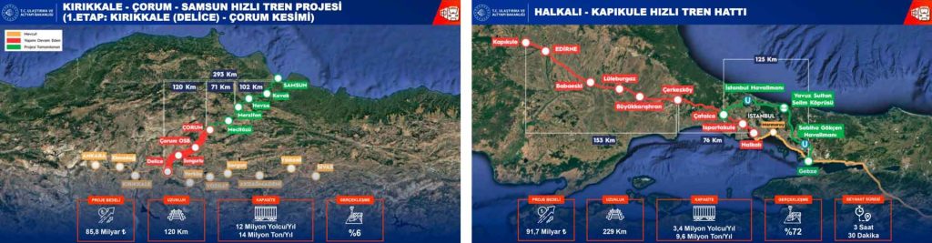 Bakan Uraloğlu, Bandırma-Bursa-Yenişehir-Osmaneli Hızlı Tren Hattında Osmaneli-Bursa arasını 2026’da Bandırma-Bursa arasını 2028’de hizmete alacaklarını ifade etti. Uraloğlu, açıklamasında şu ifadelere yer verdi: “Halkalı-Kapıkule Hızlı Tren Hattında, Çerkezköy-Kapıkule arasını 2026 yılı içinde Çerkezköy-Halkalı arasını ise 2028 yılında bitirmeyi hedefliyoruz. Yapımı devam eden Yerköy-Kayseri Hızlı Tren Hattı, Karaman-Ulukışla Hızlı Tren Hattı ve Kırıkkale-Çorum-Samsun Hızlı Tren Projesi’nin birinci etabı olan Kırıkkale-Delice-Çorum kesiminin 2028 yılı sonuna kadar bitirilmesini hedefledik.”