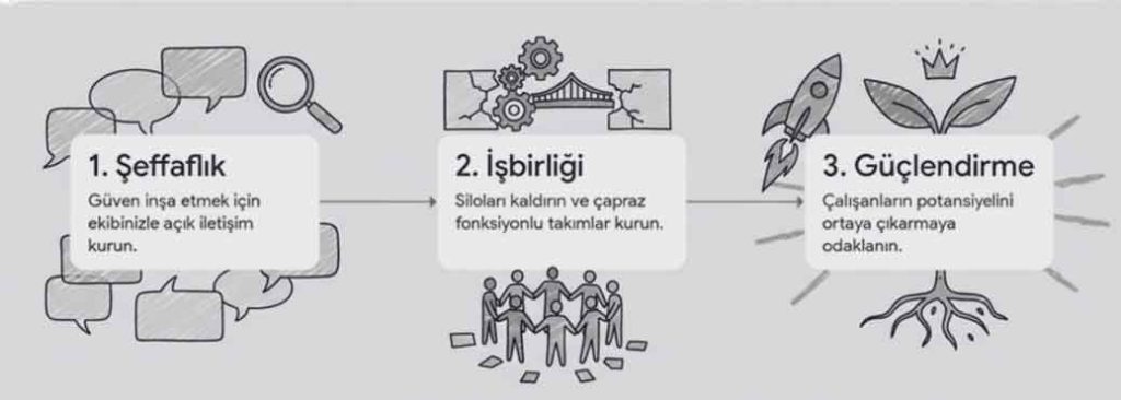 Mesela ekiplerinizin haberi olmadan yeni yöneticiler getirmek yerine onların güvenini kazanmak üzere şeffaflık ve güven ortamı sağlamak üzere aksiyonlar alıyorsunuz, değil mi? Ortaya çıkan aksaklıklardan çalışanlarınızı suçlamak yerine aksaklığın neden kaynaklandığını anlamalarını teşvik ediyor ve benzer hataların tekrar etmemesi için sistematik iyileştirmelerin yapılmasını sağlıyorsunuz sanırım. Siloları kaldırıyorsunuz, çapraz fonksiyonlu takımlarla kararların kollektif akılla alınmasını sağlıyorsunuz. Her şeyden önemlisi çalışanlarınızın potansiyelini nasıl ortaya çıkarıp işinizi büyüteceğinize odaklandınız.