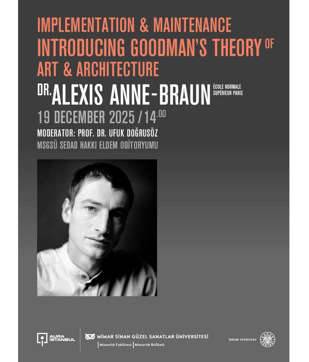 19 Aralık Cuma günü, Mimar Sinan Güzel Sanatlar Üniversitesi Mimarlık Bölümü’nün ev sahipliğinde düzenlenecek konferansta, École Normale Supérieure (ENS, Paris) bünyesinde estetik ve sanat felsefesi alanında çalışmalar yürüten Dr. Alexis Anne-Braun, Amerikalı filozof Nelson Goodman’ın sanat ve mimarlık kuramını merkeze alan sunumuyla katılımcılarla buluşacak. Etkinlik, Prof. Dr. Ufuk Doğrusöz moderatörlüğünde gerçekleşecek.