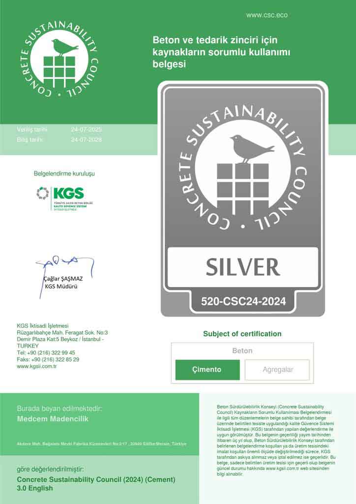 Medcem Çimento Grubu, 2021 yılında CSC sistemine dahil olarak bronz seviyede belgelendirilerek bu yolculuğa ilk adımını atmıştı. Grup, yetkilendirilmiş bağımsız kuruluşların gerçekleştirdiği kapsamlı denetimlerin ardından, 2025 yılı Temmuz ayında süreçlerini “gümüş” sertifika seviyesine taşıdı. Bu gelişme, grubun üretimin her aşamasında şeffaflık, çevresel sorumluluk, kaynakların verimli kullanımı ve iş sağlığı & güvenliğine verdiği önemin somut bir göstergesi olarak öne çıktı.