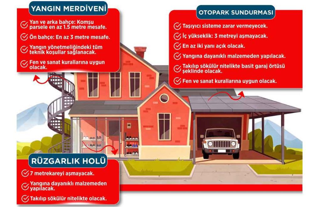 Planlı Alanlar İmar Yönetmeliği’nde bağımsız bölümlü müstakil konut ve yapılara rüzgarlık ve garaj örtüsü yapımına ilişkin de yeni düzenlemeler yapıldı. Hem villa tipi sitelerde hem de parselde yer alan müstakil konutlarda kaçak yapılaşmanın önüne geçilecek bu düzenlemeler ile komşular arasında tartışmaya neden olan rüzgarlık ve otopark yapımı konusu çözüme kavuşturuldu. Bu eklentilerin nasıl yapılabileceğine yönelik standartlar, usul ve esasları belirlendi. Bu kapsamda site içindeki bağımsız konutlarda rüzgarlık ve otopark örtüsü yapımı için önce Kat Malikleri Kurulu’ndan izin alınacak. Her iki eklenti de görsel ve yapısal olarak bütünlük arz etmek, fen ve sanat kurallarına uygun olmak, taşıyıcı sisteme zarar verilmemek, yangın önlemleri alınmak, parsel sınırları hiçbir şekilde ihlal edilmemek kaydıyla belirlenen usul ve esaslara göre inşa edilebilecek.