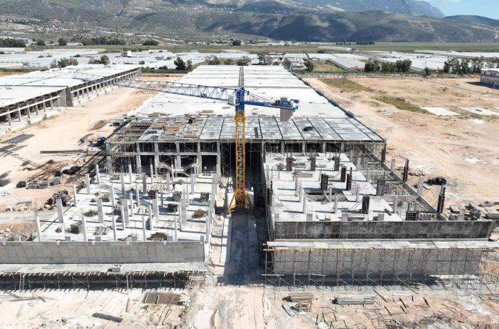 Antalya Büyükşehir Belediyesi Kaş Kınık Toptancı Hal Kompleksi Projesi hızla devam ediyor. 320 dönümlük alanda yürütülen projede, komisyoncu blokları tamamlanırken...